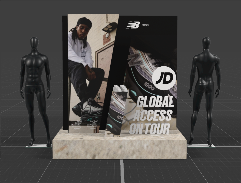 I developed the visual concept and spatial layout for the New Balance M1000 campaign. Using Adobe Dimension, I created 3D mockups to visualize scale, materials, and sightlines within the storefront environment. These renderings guided production and installation, ensuring the final execution matched the creative intent. Once approved, the build was handed off to JD’s external installation team for on-site execution.